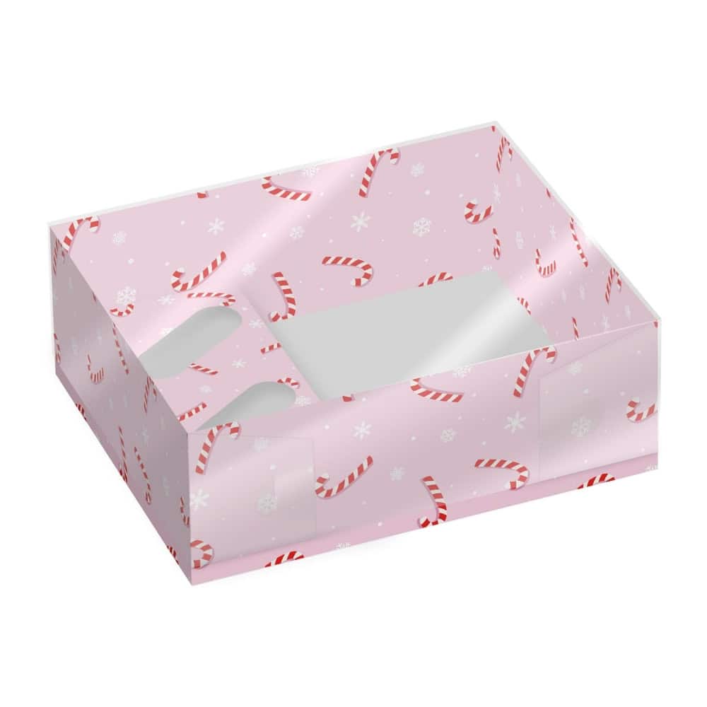 This festive hamper cupcake box has a pink background with a candy cane pattern. Perfect for adding all sorts of tasty Christmas treats!