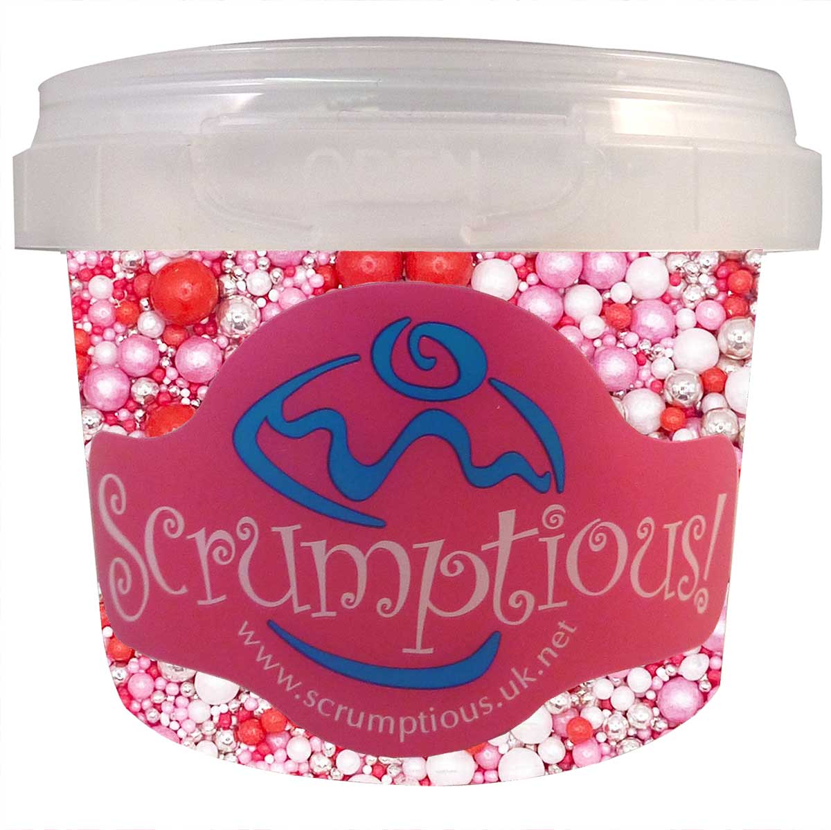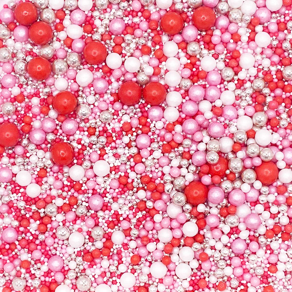 This particular mix contains a beautiful combination of glimmer and polished pink, red and mother of pearl pearls and polished red chocoballs ranging in size from 2mm 100's and 1000's and pearls to 10mm delicious chocoballs. Ideal for themed cakes, Valentines and birthday celebrations. The silver pearls give this mix a lovely twinkly finish. A unique and exciting blend.